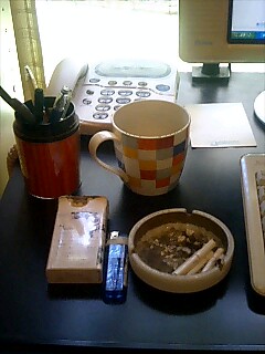 パソコン、電子辞書、ボールペン、メモ用紙、煙草、飲み物、かすみ目用の目薬。はい、丁度7つですな。