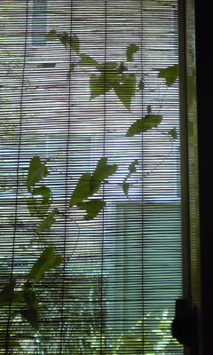 ワタクシが操るパソコンの向こう側、窓の外にはヨシズが下がっているのですが、そこにヤマノイモの蔓が張りついて、なにやらこのような状態になっているのですよ。