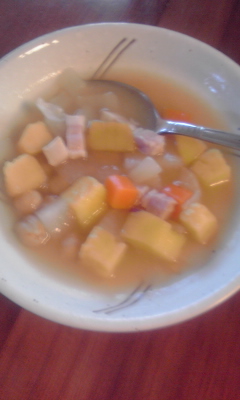 本日のブランチスープは、ベーコン、タマネギ、ニンジン、大根、サツマイモ、ひよこ豆のコラーゲン入りスープ。片栗粉でトロミをつけたので熱々。少しは血の巡りが良くなり、血も増えたか?(^^;