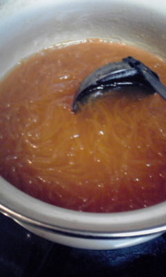 9 グラニュー糖が溶けたのを見計らって、ぺプチンをヒタヒタになるくらい投入し、残りのグラニュー糖を2、3回に分けて加えながら弱火で2時間ほど煮詰めます。「酸っぱい!まだ苦い!えー、まだまだ苦い~」と味見をしながら砂糖を加えてね(^^;