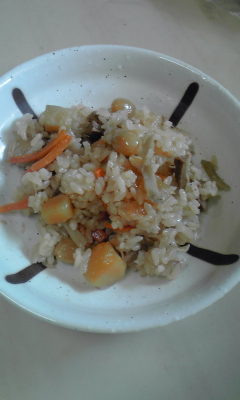 画像のご飯のように、ワタクシはサツマイモ(小さく角切りしたものをニンジンと同量くらい)を入れるのも好きです。