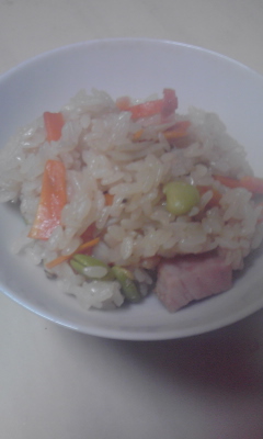 中華ちまき味のおこわにしたかったのですが、チャーシューがないのでハムで代用。