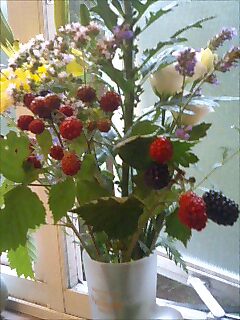 お花はさすがにこのままでは仏壇花そのまんまなので、庭のラベンダーやミントやブラックベリーを一緒に活けて雰囲気を変える。