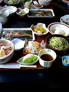 画像が途切れちゃったけど、海鮮ミニ丼、カレイの煮付け、しらすと大根のサラダ、茶そば、寄せ豆腐あんかけ、つけもの、冬瓜とカボチャと大根の煮物がお膳に乗ってます。食後に柚子のシャーベット付き。
