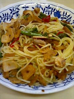 画像は、ベーコンと野菜(パプリカ、アスパラガス、ブロッコリー)を加えたペペロンチーノ風パスタ。