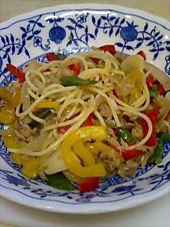 材料/赤と黄色のパプリカ、スナップエンドウ、タマネギ、ニンニク、ツナ缶、塩コショウ、醤油、オリーブオイル。全て炒めてパスタに絡めるだけの超簡単料理。