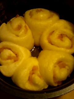画像は広げた生地にマーマレードを塗り、端からクルクル巻いてからカットして焼いたパンです。シロップが漏れて生地がヌルヌルベタベタ。扱いにくかったけど、まずまずの出来上がりでしょう?