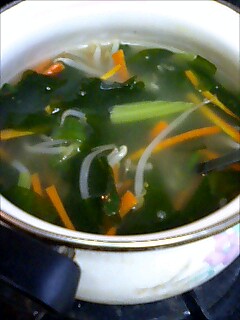 2 沸騰したスープの中に、ニンジン、モヤシ、乾燥わかめ、小松菜、ニラを投入。ひと煮立ちさせて火を止めます。