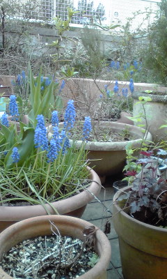 今年はチューリップを植え忘れたものの、数年越しのムスカリがアチコチで元気一杯に咲いてます。