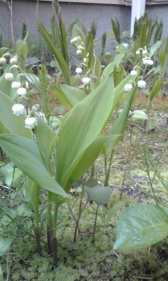 スズランも咲き始めました。奥に見えているのは、まだ硬い蕾のシラン。