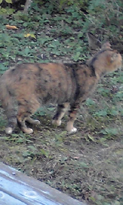 茶トラが墨汁を被っちゃったのを適当に拭いたらこうなった、みたいな毛色をしている。因みにメス猫。多分、若い。一、二歳前後か?