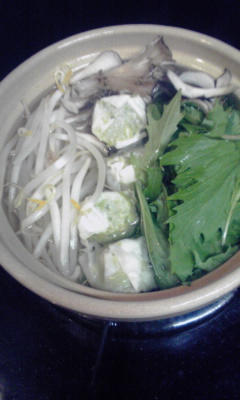 水菜2株、もやし3分の1袋、舞茸少々、ほうれん草入りのシュウマイ4個。白菜も白滝も入れたかったけど、これで鍋一杯!