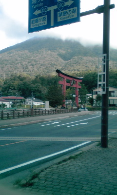 二荒山神社入り口の鳥居から臨む男体山山頂は、既に雲に覆われてます。