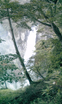 道端から眺める華厳の滝はこんな感じ。樹木が被さるように茂り、さすがに良く見えなーい。