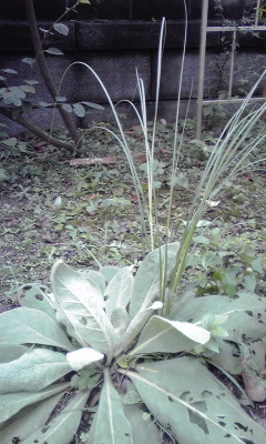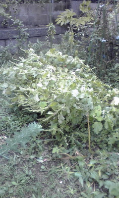 手前の銀色がかったデッカイ葉っぱの植物はシルバームレインです。たまに思い出したように、庭のあちこちで発芽するんですよ、これ。