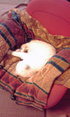 バーリバリ爪を磨ぐので、座面はタオルケットでガッチリ保護。